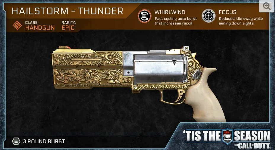 Starting off with the Hailstorm pistol, available to anyone who's played Black Ops III or Infinite Warfare, is a pretty good looking 3-round burst pistol packing some pretty good looking perks.