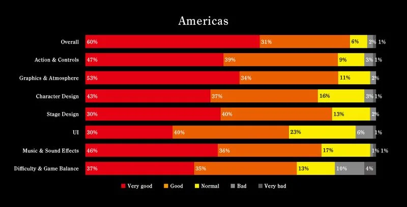 The charts for the survey results are split up by region, and vary wildly. It appears players in Asia did not take to the game, especially the crushing difficulty. Players in the Americas enjoyed the game, rating it as 60% "Very Good" overall.
